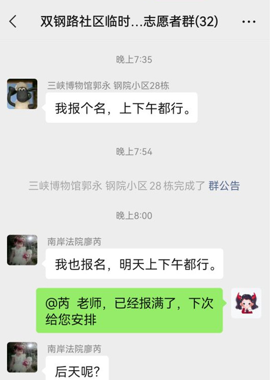 11月18日,雙鋼路社區被列為高風險地區,疫情防控形勢愈加嚴峻,為更好地服務社區居民,做好防疫工作,雙鋼路社區成立了志愿服務臨時黨支部,踏實肯干的李淑娟被推選為臨時黨支部書記。新的身份,新的使命,新的挑戰,李淑娟的戰場轉移到了管理志愿者團隊上,招募志愿者,協調安排每日工作內容成了李淑娟新的工作,“如今我們的臨時黨支部已經從最初的十余人壯大到了32人。”看著日漸壯大的隊伍,李淑娟滿是欣慰。