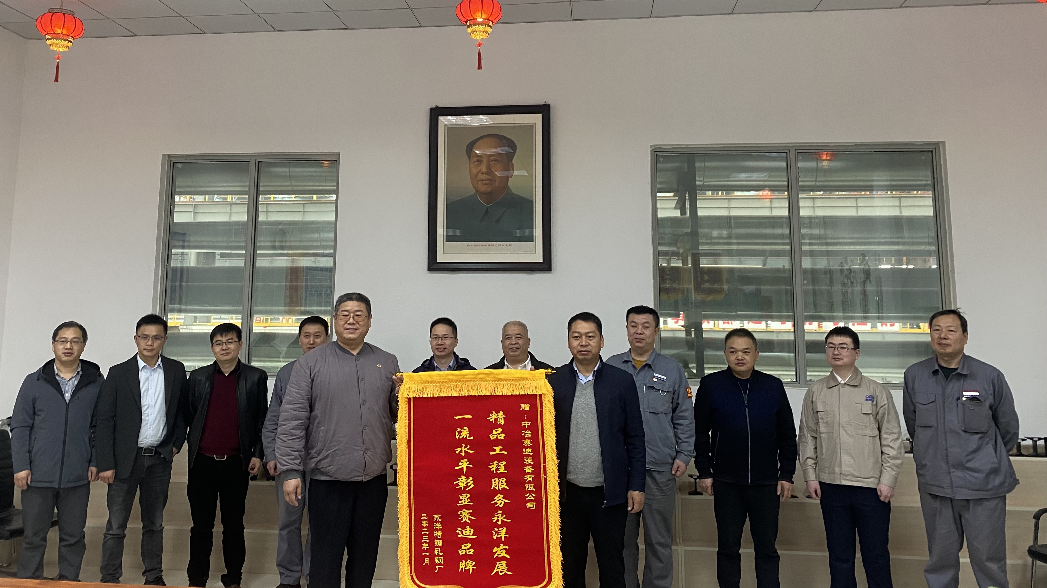 2023年2月28日,適逢永洋特鋼重軌線正式生產(chǎn)一周年,河北永洋特鋼集團(tuán)有限公司軋鋼廠贈(zèng)予賽迪裝備錦旗,給予“精品工程服務(wù)永洋發(fā)展,一流水平彰顯賽迪品牌”的高度評(píng)價(jià),以此感謝裝備公司為永洋特鋼重軌線項(xiàng)目提供的優(yōu)質(zhì)技術(shù)裝備和優(yōu)良服務(wù)。