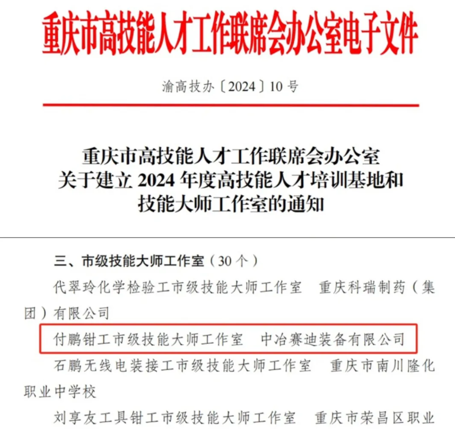9月24日,重慶市高技能人才工作聯席會辦公室下發《關于建立2024年度高技能人才培訓基地和技能大師工作室的通知》,賽迪裝備申報的“付鵬鉗工市級技能大師工作室”成功獲批建設。技能大師工作室由重慶市委組織部與重慶市人力資源和社會保障局聯合組織建立,本次成功獲批是對公司技能人才培養工作的認可和支持,為公司今后的高技能人才隊伍建設提供了更加堅實的政策保障。